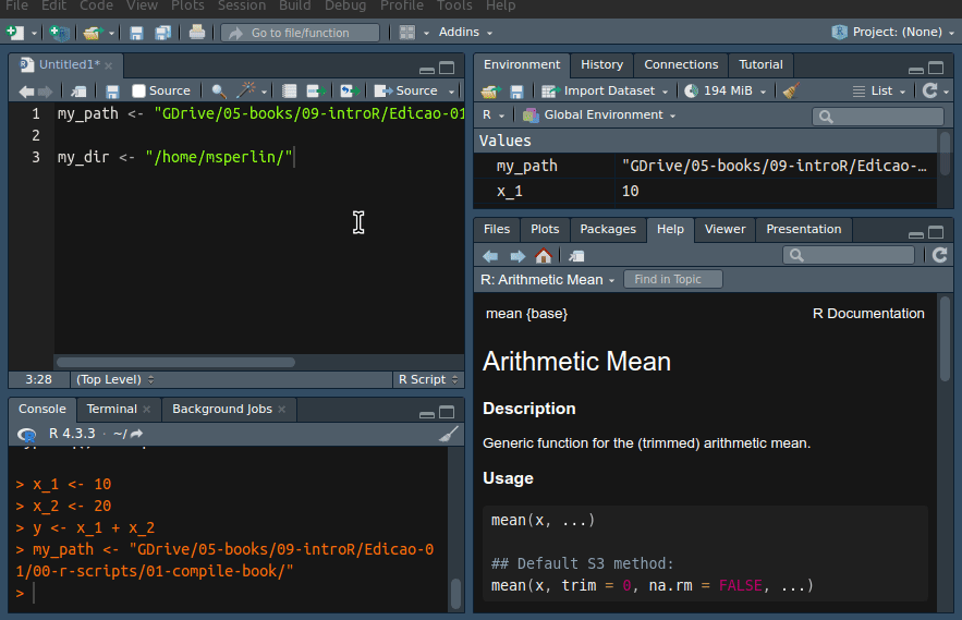 devtools::install_github('msperlin/introR')O que este código fará é instalar o pacote devtools, uma dependência necessária para instalar código do Github – um repositório de pacotes onde o livro está hospedado. Depois disso, uma chamada para devtools::install_github('msperlin/introR') irá instalar o pacote em seu computador. Depois da instalação, todos os arquivos do livro estarão disponíveis localmente, salvos em uma pasta do seu computador.