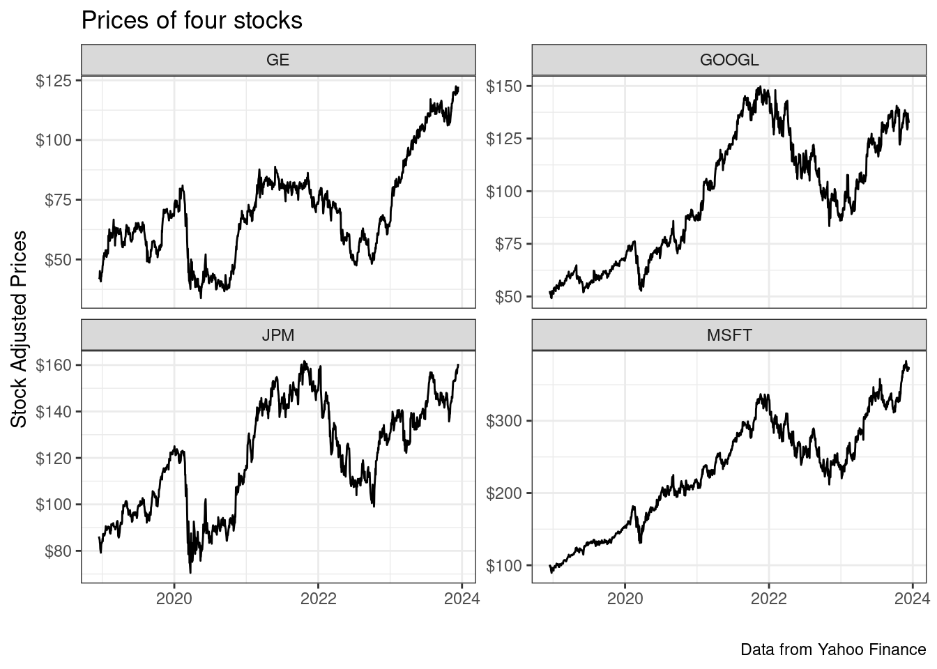 As an example of usage, let’s download the prices of four stocks in the previous five years using function yfR::yf_get() . We choose these companies: Microsoft (MSFT), Google (GOOGL), JP Morgan (JPM) and General Electric (GE).