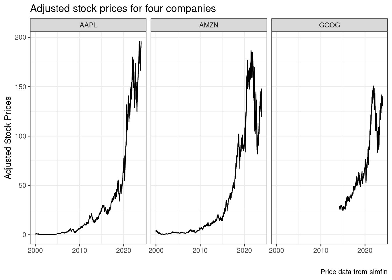 As expected, we find information about stock prices, daily returns and traded volumes. Notice it also includes column ticker, which contains the symbols of the stocks. In the tidy format, each stock has a chunk of data that is pilled in top of each other. Later, in chapter 8, we will use this column to split the data and build summary tables. To inspect the data, create a figure with the prices: