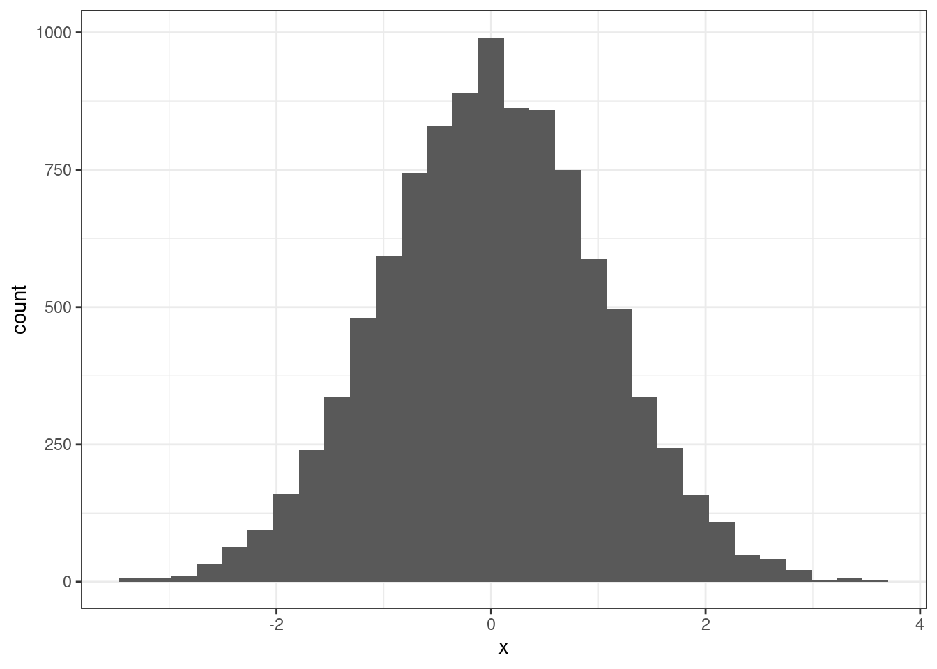 # generate 10000 random numbers from a Normal distributionmy_rnd_vec <-rnorm(n =10000,mean =0,sd =1)# print first 20 elementsprint(my_rnd_vec[1:20])