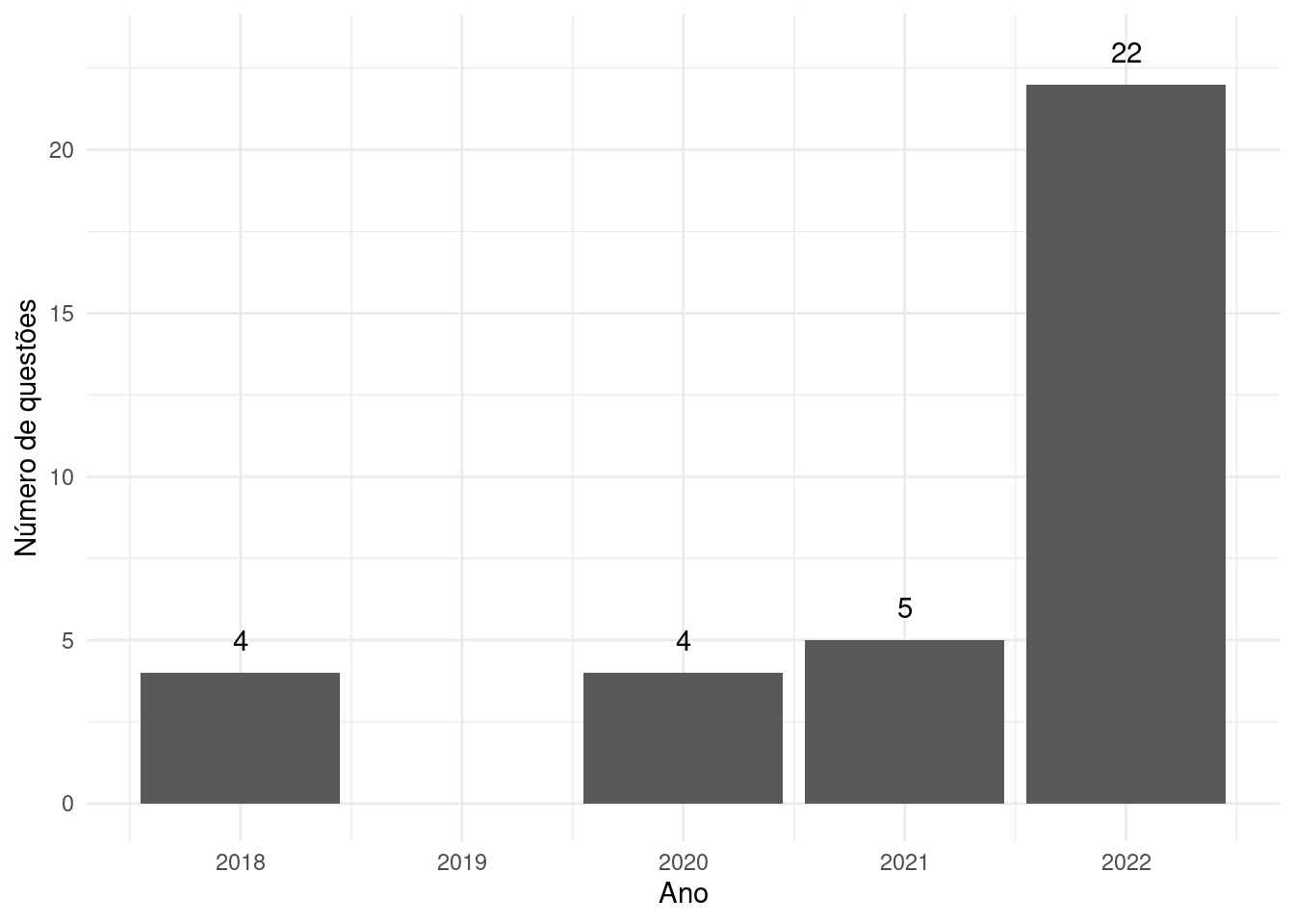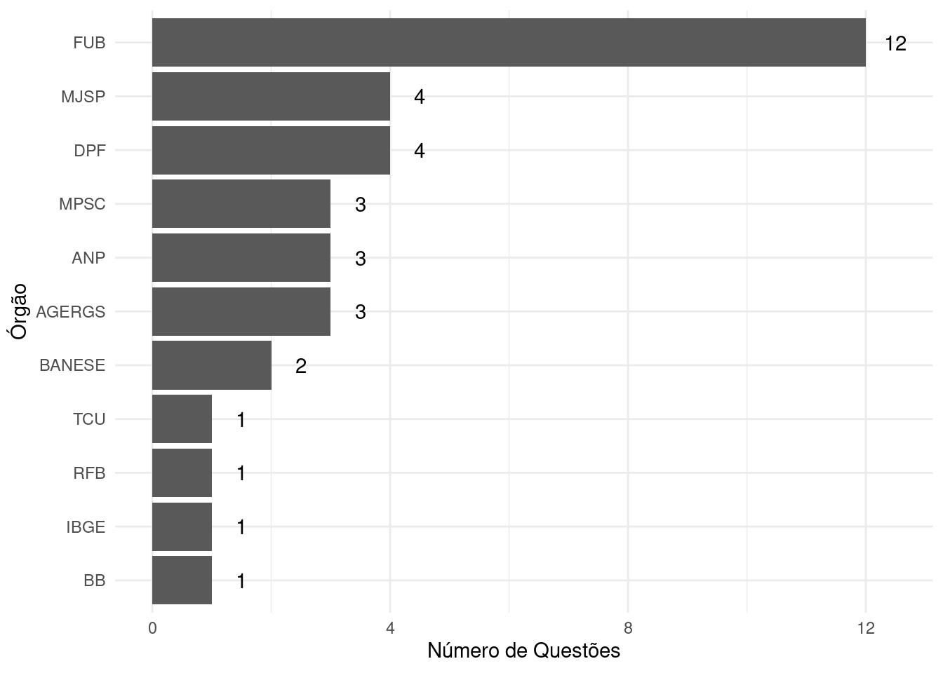 Como podemos ver, o número de questões aumenta substancialmente em 2022. Prevejo que, assim como o que aconteceu com a linguagem Python, esse padrão se confirme nos próximos anos. Em relação aos órgãos, os principais são FUB (Fundação Universidade de Brasília) com 12 questões sobre R no concurso para o cargo de Estatístico, e MJSP (Ministério da Justiça e Segurança Pública) com 4 questões no cargo de Cientista Social.